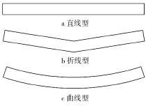 影響垂直螺旋輸送機(jī)性能的操作變量有螺旋轉(zhuǎn) 速、進(jìn)口速度、填充系數(shù)、螺旋葉片的形狀、顆粒的形狀等。試驗(yàn)選取進(jìn)口速度為 10 m/s,由文獻(xiàn)[5]可知,填充系數(shù)對平均顆粒速度、平均顆粒軸向速度、平均顆粒周向速度的影響很小,而本文中主要分析近軸處的 平均顆粒周向速度、近壁處的平均顆粒軸向速度,因 此可選填充系數(shù)取做一個(gè)固定參數(shù),即填充系數(shù)為 50%,忽略顆粒形狀對輸送性能的影響,因此試驗(yàn)選 取了螺旋轉(zhuǎn)速、螺旋葉片作為操作參數(shù),來展開詳細(xì) 的試驗(yàn)設(shè)計(jì)。 根據(jù)文獻(xiàn)[5]的分析,選取螺旋轉(zhuǎn)速參數(shù)分別為600、900、1 000、1 200、1 400、1 600、1 800 r/min;螺旋 葉片母線的形狀分別為直線型、折線型、曲線型,其形 狀簡圖如圖 2 所示,由排列組合知識可知,需要進(jìn)行21 次試驗(yàn)。