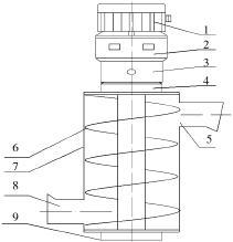 1.電動機(jī),2.減速器,3.機(jī)座,4.上軸承座,5.出料口, 6.螺旋葉片,7.殼體,8.進(jìn)料口,9.下軸承座